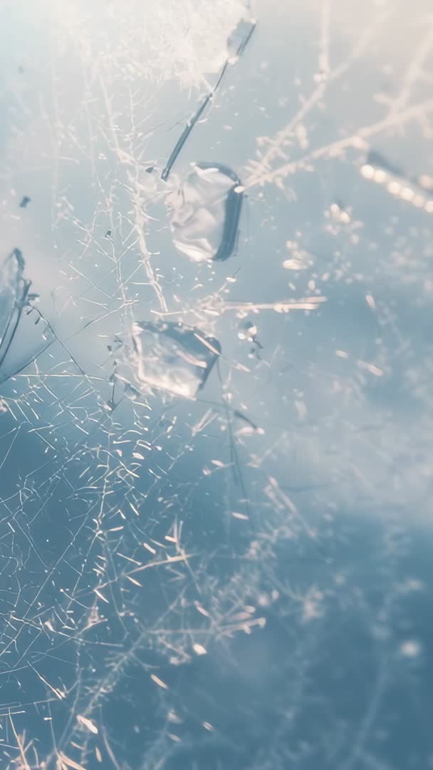AI Generated Image. Tilting camera revealing radial crack network across glass pane while two chips and scattered shards drifting through shallow depth of field against soft gray sky. Featuring cool blue-gray palette, delicate microcracks, sparkling highlights and subtle bokeh for moody, cinematic atmosphere. Vertical video orientation and smooth camera movement making footage ideal for mobile-first projects, reels and portrait advertisements. Use for title sequences, cinematic transitions, risk and safety campaigns, insurance and repair commercials, news or editorial segments about vandalism or storm damage, product promos for screen protectors or glass manufacturers, and abstract art or background overlays. Combine with text overlays, slow-motion audio cues or color grading to amplify tension, fragility or minimalist aesthetic.