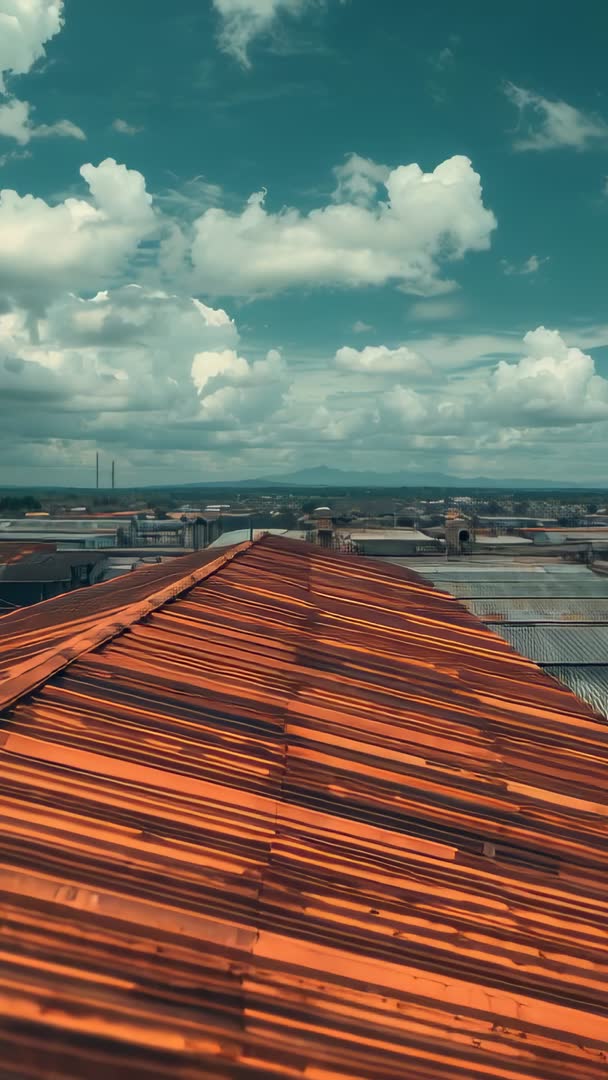 AI Generated Video. Vertical video showing tilting camera revealing rusted orange corrugated metal ridge stretching toward distant urban horizon under dramatic cumulus clouds. Foreground focusing on weathered seams and ridged texture of metal roofing, midground showing dense cluster of industrial rooftops, background showing flat plain and faint mountain outline. Warm orange tones on roof contrasting with cool teal sky, creating cinematic mood. Serving industrial and construction content, urban landscape storytelling, roof inspection and condition reports, real estate and property marketing highlighting rooftop views, environmental or decay narratives, broadcast or online title sequences, mobile-first social media ads, vertical video backgrounds for websites and apps, insurance claim visuals, architectural portfolios. Clip working well as transition shot, establishing rooftop perspective, or texture overlay. Offering vertical 9:16 aspect ratio, handheld tilt motion, steady horizon alignment, and high visual contrast suitable for color grading and motion graphics.