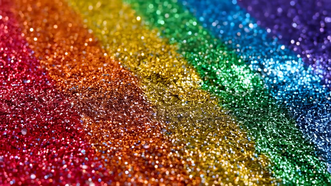 AI Generated Image. Macro video showing camera tilting over dense rainbow glitter, producing shifting sparkles, bokeh highlights, and prism-like reflections. Close-up tracking across red, orange, yellow, green, blue, violet bands, revealing detailed textured sparkle and iridescent shimmer. Ideal for looping backgrounds, animated overlays, social media reels, title intros, and product presentation, especially for beauty, fashion, craft, party, and pride month projects. Works well for website hero banners, digital invitations, promotional ads, and motion graphics where vibrant color and tactile texture are needed. Recommend experimenting with speed ramps, color grading, and blend modes to create custom transitions or layered visual effects.