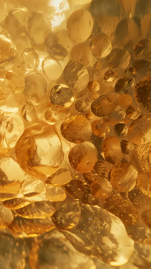 AI Generated Image. Video showing close-up tilting of warm amber glass panel studded with bubble nodules, backlit lamp creating golden glints, translucent layers, and textured refractions. Macro framing capturing light play, highlights, and soft bokeh at edges for rich, tactile feel. Vertical orientation (9:16) optimized for mobile platforms and social stories. Use for backgrounds, motion overlays, product packaging, luxury branding, interior design promos, ambient screensavers, editorial video intros, and animated title sequences. Editing tips: loop short segment for seamless background, apply slow exposure ramp to enhance shimmer, add subtle parallax or zoom for depth, and combine with warm color grades for cohesive brand look.