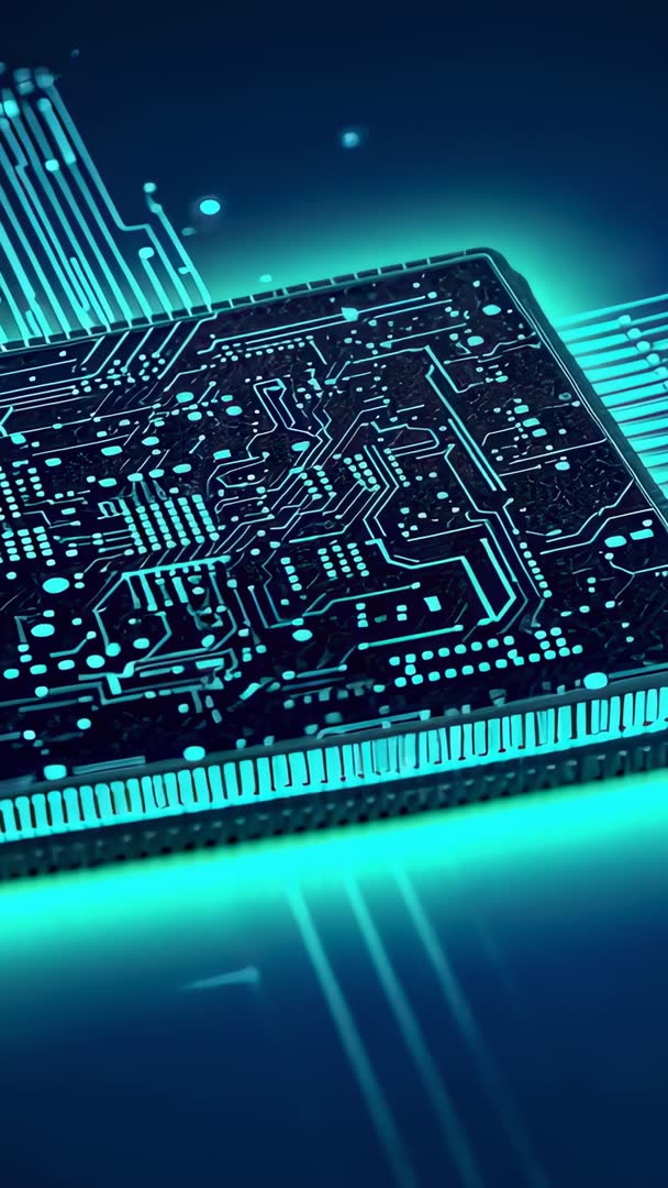 AI Generated Image. Tilting microboard showing pulsing PCB traces and exposed contact pins with neon cyan glow in vertical frame. Close-up camera movement highlighting trace pathways and connector edge for inspection and diagnostics. Clip suiting tech promo, hardware review, electronics tutorial, product launch, corporate presentation background, and social media vertical ad. Use as looping background, hero shot for tech branding, or overlay for explainer video and product demo. Recommend adding minimal lower-third text, soft ambient electronic soundtrack, and subtle zoom or parallax to enhance depth. Provide high-contrast thumbnail and safe-zone cropping for mobile delivery. Perfect for showcasing PCB design, assembly process, diagnostics workflow, semiconductor marketing, IoT device reveal, and futuristic UI concept.
