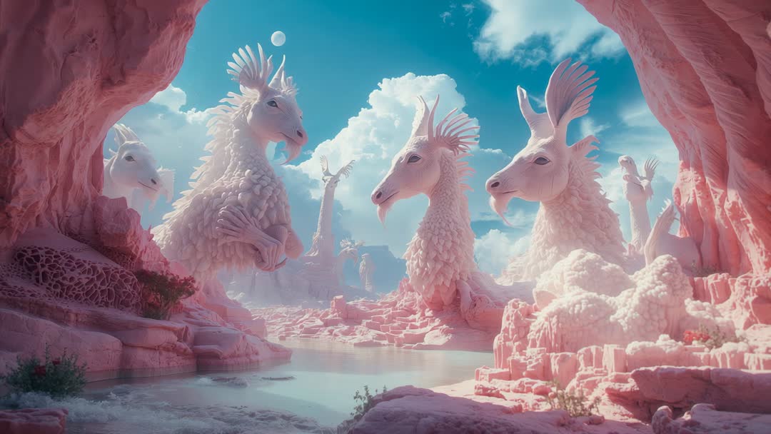 AI Generated Image. Video showing tilting plumed herd shifting heads beside pink rock lagoon while camera pushing forward and luminous orb drifting across sky. Soft pastel palette of pink rock and azure sky creating dreamlike, serene mood. Creatures featuring crest feathers and layered plumage moving with slow, graceful motions, casting reflections on still lagoon and interacting with light and cloudscape. Great for fantasy film opener, game trailer, concept art showcase, meditation background, book trailer for fantasy novel, VFX showreel, or social media cinematic short. Technical notes recommending 4K capture, slow-motion playback, loopable edit for seamless backgrounds, color grading toward warm pastels, and ambient sound design with gentle water, wind, and choral pads to enhance immersive feeling.