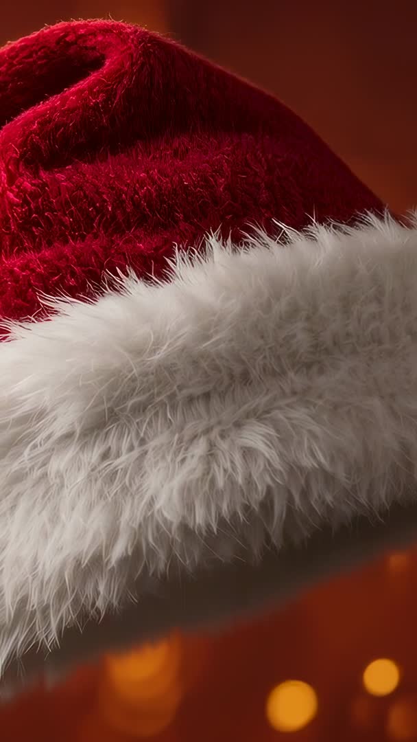 - Tilting red Santa hat shifting over warm bokeh showing fluffy white fur closeup vertical video