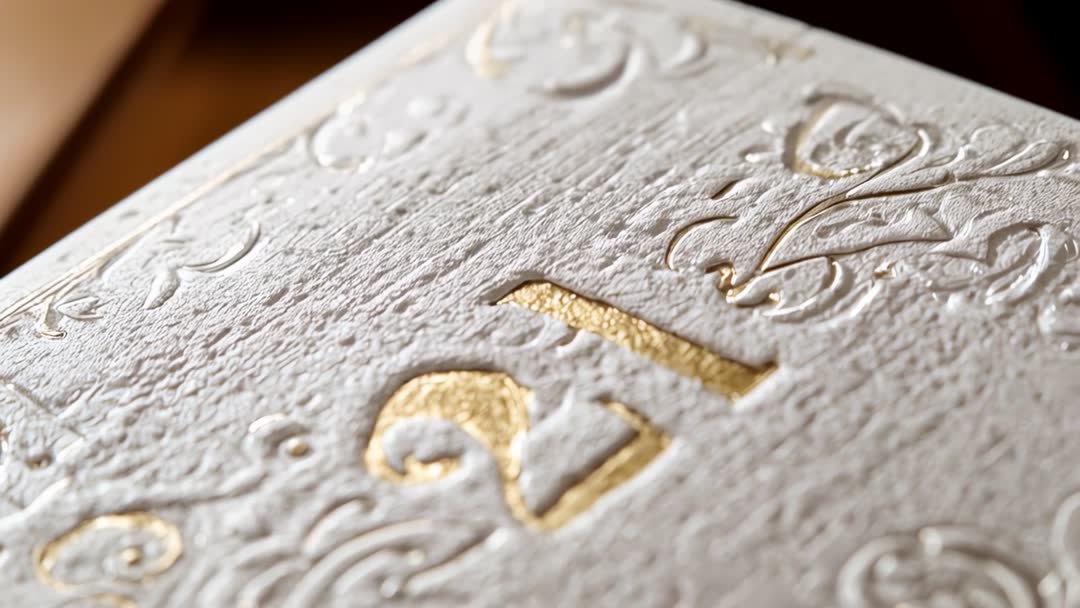 AI Generated Image. Video showing tilting reveal of embossed white card with gold foil 21, capturing macro detail of handmade paper texture and ornate raised design. Warm directional lighting and shallow depth of field creating soft golden highlights on foil and tactile shadows across deckled paper surface. Useful for 21st birthday and milestone celebration projects, luxury stationery and invitation campaigns, high-end branding and packaging presentations, wedding invitation showcases, editorial spreads and blog posts about letterpress and foil stamping techniques. Suitable for hero banner, social media reel, product listing close-up, print brochure, design portfolio and background texture use in motion graphics. Filename-ready keywords and crop-friendly composition enabling easy trimming for square and vertical video formats.