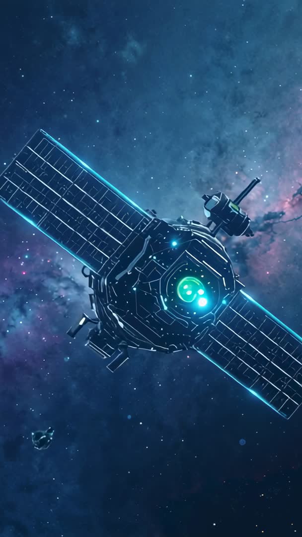 AI Generated Image. Showing vertical video of tilting modular spacecraft rotating and drifting through colorful nebula and starfield, revealing glowing green core and extended solar arrays. High-contrast neon blues and greens creating cinematic sci-fi atmosphere, deep space background providing negative space for titles and lower-third graphics. Perfect for use in sci-fi trailer, technology promo, space documentary opener, streaming service background, mobile vertical ad, story or reel content. Suitable for broadcast bumpers, app splash screens, UX prototypes, educational astronomy content, corporate innovation presentations. Recommending editing workflow: extending safe area at top and bottom, applying subtle lens flares and particle overlays, syncing rotation speed to soundtrack for dramatic impact. Rendering vertical 9:16 for mobile platforms, cropping to 16:9 when needed while keeping core centered. Licensing suggestions include hero shot for futuristic product launch, social media campaign, website header, onboarding screen or lock-screen backdrop.