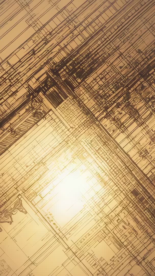 AI Generated Video. Vertical 9:16 video featuring tilting camera exploring layered geometric grid in warm sepia with central bright square. Providing moody cinematic texture for technology promos, architecture reels, art installations, social story content. Allowing overlaying of bold headlines, logo reveals, lower-third graphics over dark outer edges while central glow guiding focus. Looping-friendly composition offering seamless motion for background loops, visualizer animations, slideshow transitions. Delivering high-resolution vertical file for mobile campaigns, story ads, app intros, digital signage. Color grading flexibility supporting warm tonal palettes or conversion to monochrome for vintage tech look. Useful for creative directors, video editors, motion designers, marketers seeking modern abstract tech aesthetic.