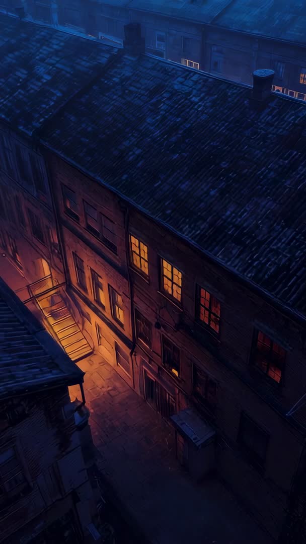 AI Generated Image. Vertical video showing tilting camera moving from rooftop down into narrow urban courtyard, revealing warm lit windows, back stairs, and textured tiled roof. Color palette mixing deep midnight-blue shadows with amber window glow, creating cinematic moody atmosphere. Footage working well for film openers, title sequences, music video backgrounds, social reels, and promotional trailers. Use in architectural studies, urban design presentations, or mood boards highlighting nighttime lighting, texture, and spatial depth. Frame composition allowing overlaying text or logo on top third while camera motion adds subtle dramatic reveal for product placement or storytelling. Optimized for vertical-first platforms like Instagram Reels, TikTok, Snapchat Spotlight, and mobile advertising. Add optional sound design with distant city ambience, soft footsteps, or gentle rain to enhance immersive feeling. Recommended for editors and creators needing moody vertical B-roll or cinematic city backdrop for commercial or editorial projects.