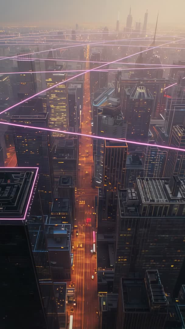 AI Generated Image. Vertical video showing tilting camera zooming down between neon-lit skyscrapers at dusk, revealing magenta and purple light lines connecting rooftop edges and forming grid above city. Cinematic color palette combining warm street glow and cool neon accents creating futuristic mood. Composition emphasizing vertical depth, glowing street trails, and high-rise silhouettes for immersive urban impact. Video working well for science fiction trailer, tech product launch, smart city concept, virtual network visual, electronic music video, and urban architecture reel. Use for app intro, social media vertical ad, background for title cards, broadcast opener, presentation on connectivity and IoT. Editing suggestions include adding subtle camera shake, slow motion reveal, lens flares, color grade to boost cyan-magenta contrast, and overlay particle effects. Aspect ratio optimized for vertical screens and mobile platforms.