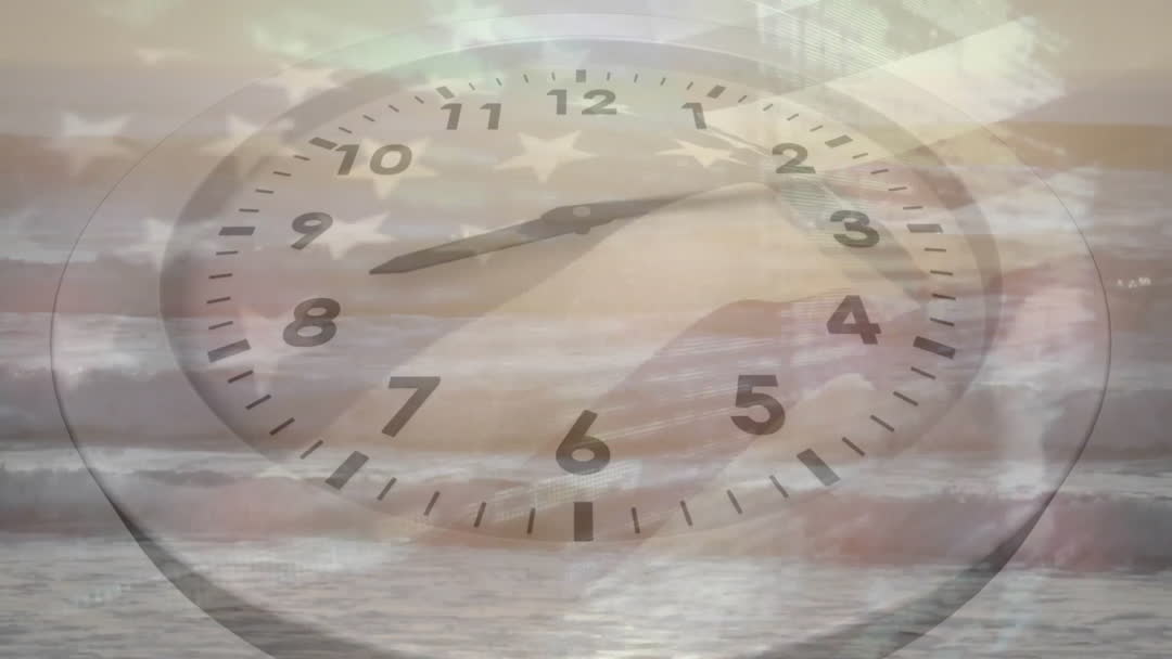 Conceptual representation of time and patriotism featuring a clock overlayed on an ocean and American flag. Symbolizes timelessness, national pride, flow of time, and freedom. Can be used for themes involving U.S. Culture, national holidays, or ecological awareness tied to time.