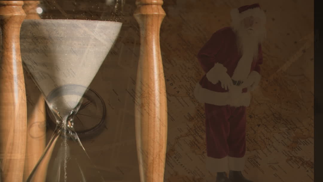 Concept video featuring hourglass, Santa Claus, and world map ideal for illustrating themes of time travel and adventure. Perfect for holiday season promotions, travel blog posts, or educational materials on history and exploration.