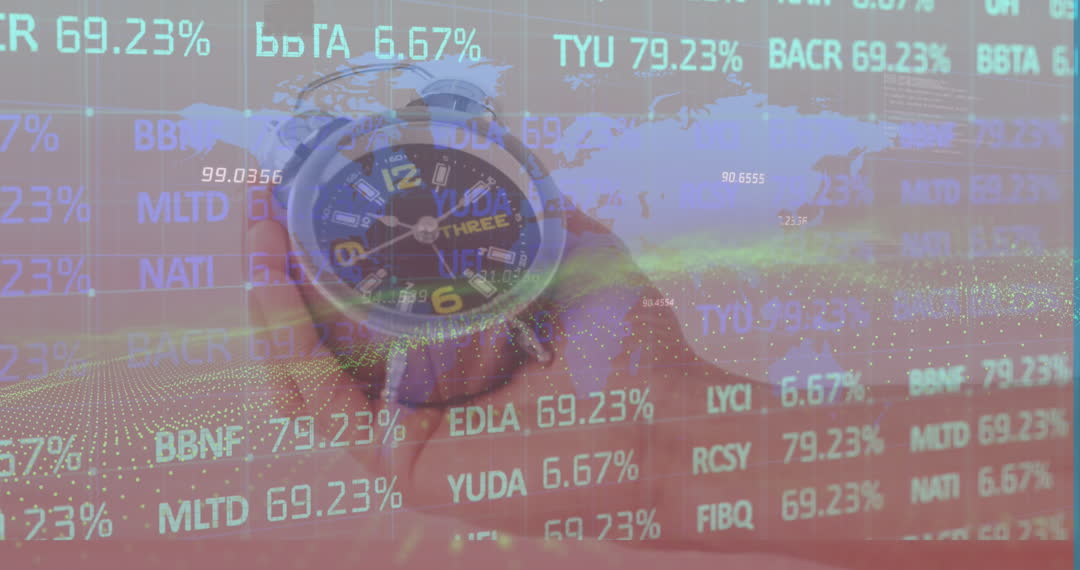 A hand holds a clock with a global map background overlaid with digital financial data, blending concepts of time management and advanced technology. Ideal for illustrating themes related to finance, global management, stock market dynamics, or digital innovation.