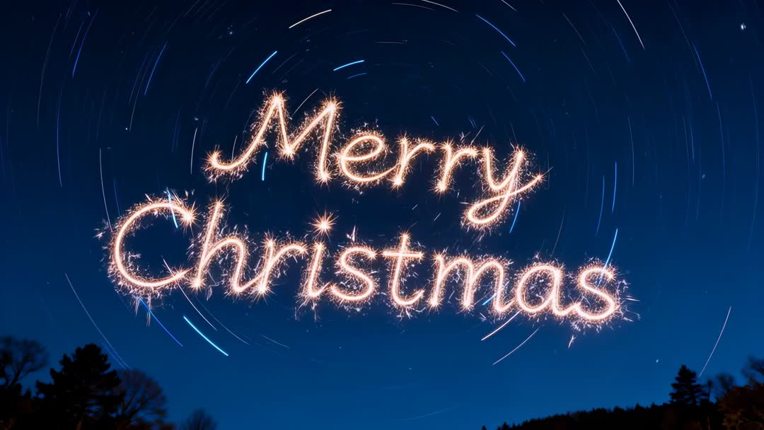 AI Generated Video. Video clip showing sparkler writing Merry Christmas in cursive above rural hill while star trails rotating across deep blue night sky. Long-exposure light painting producing glowing gold script with drifting sparks and circular star arcs from extended exposure. Scene conveying festive mood, warm sparkle contrast, and serene outdoor atmosphere. Suitable for holiday greetings, seasonal social media posts, festive website banners, event promotion, greeting card animations, and hero backgrounds for video intros. Serving as looping background or overlay for titles, countdowns, and transitions. Clip working well with warm typography choices, vintage color grading, and slow dissolve edits. AI-generated elements present.