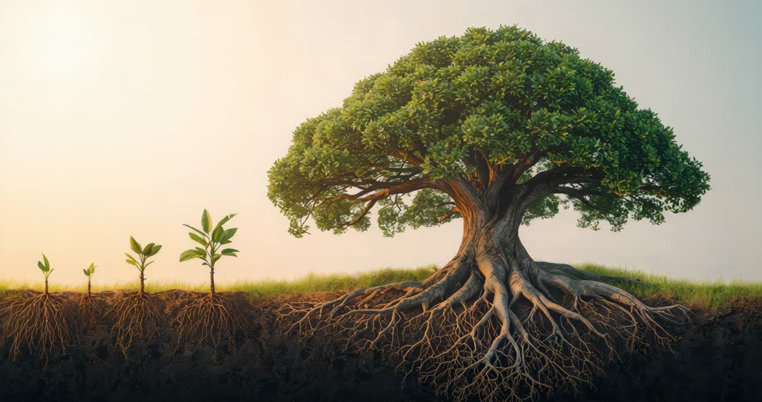 AI Generated Image. Experience the magical progression as a plant evolves from a tiny seed into a fully-fledged tree, featuring the intricate details of its root system and lush canopy. Captured outdoors, this depiction highlights the wonder of ecology, displaying the plant’s stages of growth with precision. Perfect for projects focused on nature illustration, environmental education, and ecological vitality, it tells the story of connectivity and biodiversity in a palpable way.