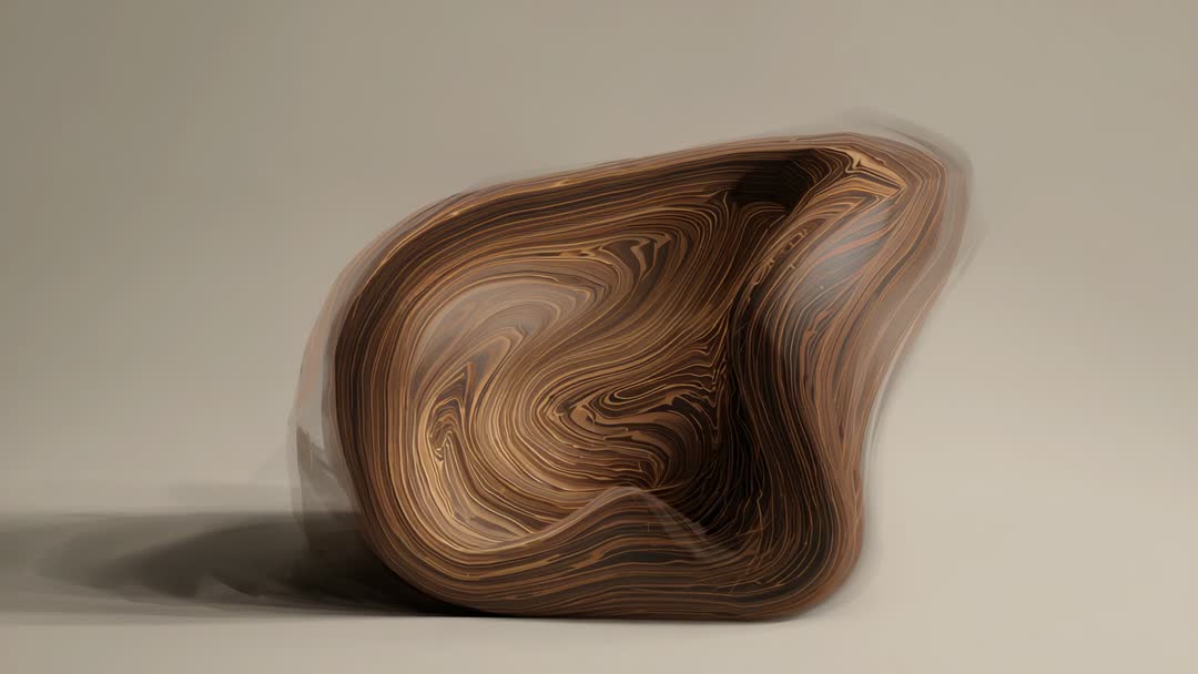 AI Generated Image. Showing time-lapse video clip of rolled laminated wood layers forming organic swirled sculpture. Camera panning right, capturing subtle motion blur and softening edges, with wood grain lines creating hypnotic contour patterns. Lighting bathing surface in warm tones, highlighting layered grain and lacquer sheen. Working well for woodworking blog headers, furniture design reels, material texture studies, architecture concept films, contemporary art promos, and craft studio showreels. Serving as background for title overlays, product intros, social media reels, website hero banners, and design portfolio presentations. Editing tips: looping short segment for seamless motion, slowing down for detail study, applying warm color grade and vignette for depth, adding subtle ambient sound for tactile atmosphere. Suiting editorial and commercial licensing, especially for content about craftsmanship, sustainable materials, furniture design, and material innovation.