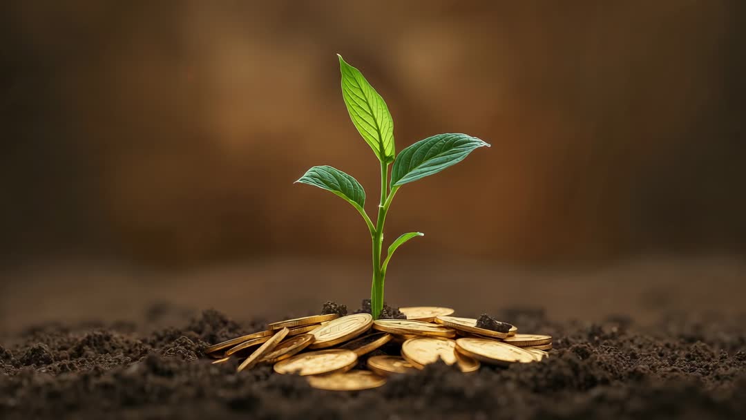 AI Generated Image. Video showing single green seedling growing from pile of gold coins nestled in rich brown soil, providing clear visual metaphor for investment growth, wealth building, and financial planning. Warm studio lighting and shallow depth of field creating cinematic, focused look that draws viewer attention to sprout. Suitable for financial services marketing, investor presentations, bank and fintech websites, crowdfunding campaigns, startup pitch decks, and sustainability finance content. Working well as looping background for landing pages, social media reels, explainer videos, and broadcast spots with ample space for headline or logo overlays. Offering flexible framing for text animation, voiceover narration, and motion graphics to reinforce themes of return on investment, savings, and long-term growth.
