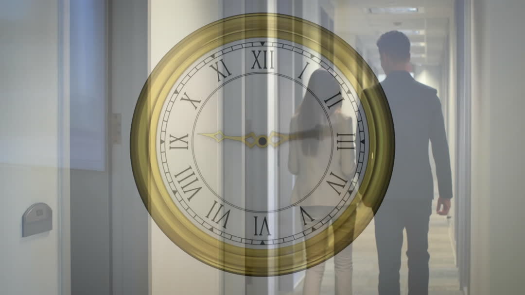 Visual focuses on the concept of time management by overlaying a working clock with two colleagues walking purposefully through a modern office hallway. Idea symbolizes productivity and discipline in professional environments. Suitable for illustrating punctuality principles in presentations, business development articles, or workplace training materials.