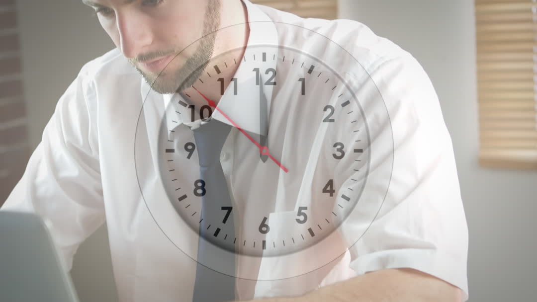 This scene captures a business professional focused at work, overlaid with an analog clock, symbolizing the concept of time management in a corporate setting. The man wears formal attire, contributing to a theme of professionalism. The visual is ideal for corporate presentations on productivity, time management workshops, or marketing materials related to efficiency solutions.
