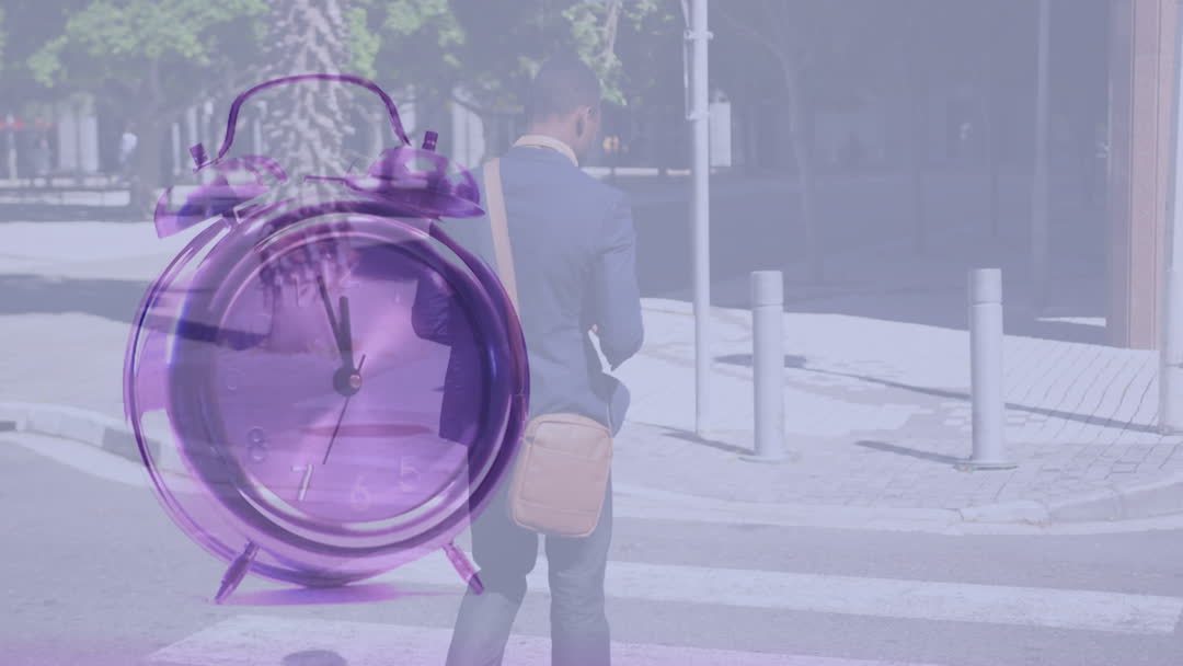Conceptual blend of an African American businessman walking in a lively city scene with a transparent clock overlay symbolizing the idea of managing busy schedules. Suitable for illustrating themes of efficiency, productivity, or balancing work tasks in fast-paced environments. Ideal for use in advertising, business publications, and digital media highlighting modern business lifestyles.