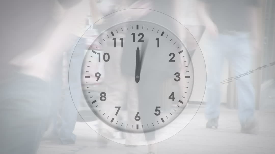 Time Management Concept with Clock Overlay on Busy Pedestrians Video