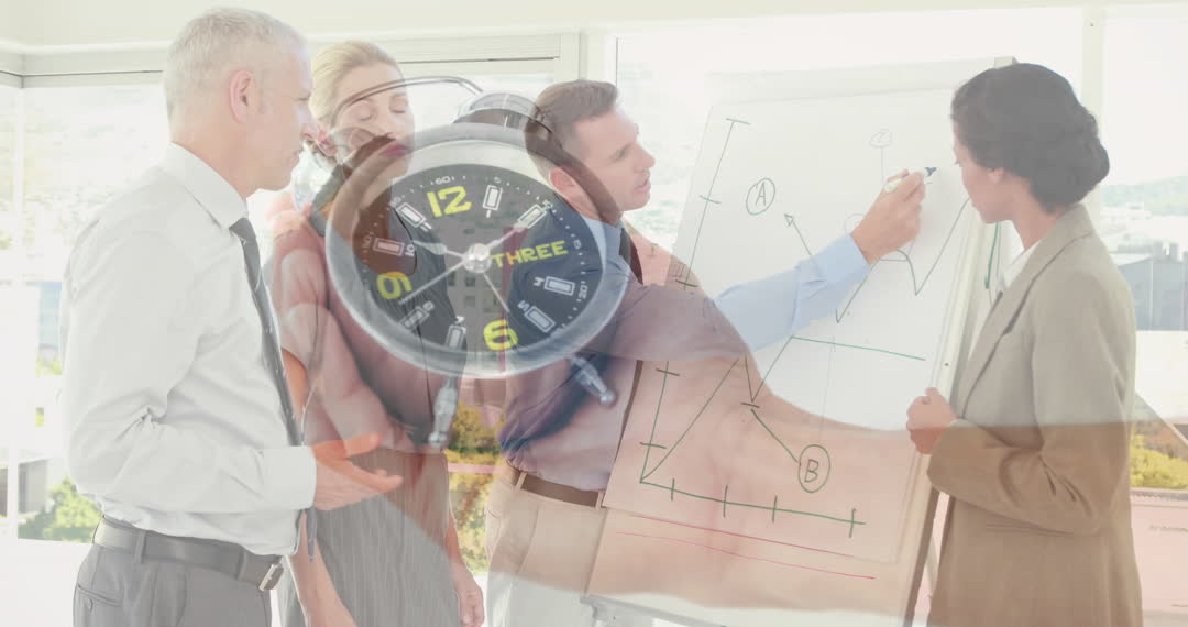 An imaginative representation of business teamwork enhanced by an overlay of a clock symbolizing the critical role of time management in a productive work setting. Ideal for illustrating themes related to leadership, strategic planning sessions, or coaching materials aimed at increasing organizational efficiency.
