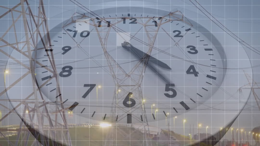 The overlay of a clock over videos of electricity pylons and street transportation symbolizes the intricate relationship between time management and urban infrastructure development. This visual can be used in presentations focusing on energy management, urban transportation networks, efficient city planning, or global business tactics. It speaks to the balance needed between infrastructure demands and time-sensitive execution in smart city concepts.