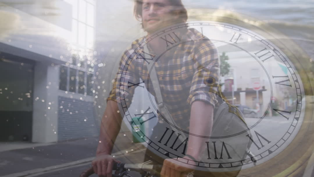 Image shows a creative concept blending motion and time manipulation with a man cycling on an urban street, superimposed with a clock face and ocean graphics. Ideal for illustrating motion, time concepts, urban transportation, content around sustainability in city commuting, or conceptual ideas for videos or presentations in technology or modern environments.