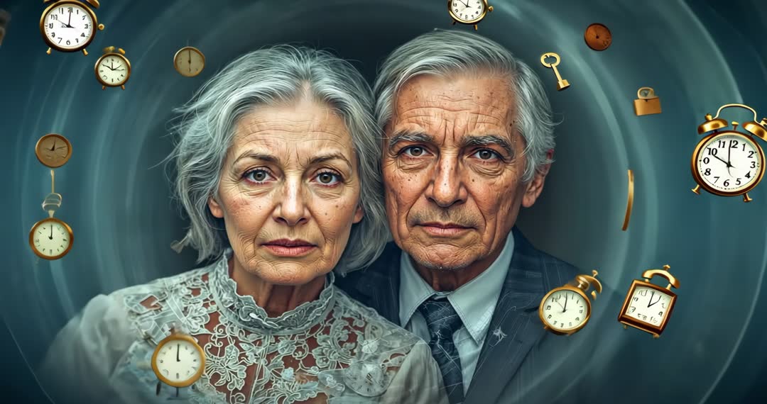 AI Generated Image. This video highlights the passage of time, featuring a senior couple with clocks, keys, and padlocks encircling them. Their deeply focused gazes coupled with the symbolic elements suggest a theme of introspection, memory, and legacy. Ideal usage includes discussions on aging, the psychology of memory, or campaigns focused on seniors. It can also contribute to content about time, reflection, or family histories.
