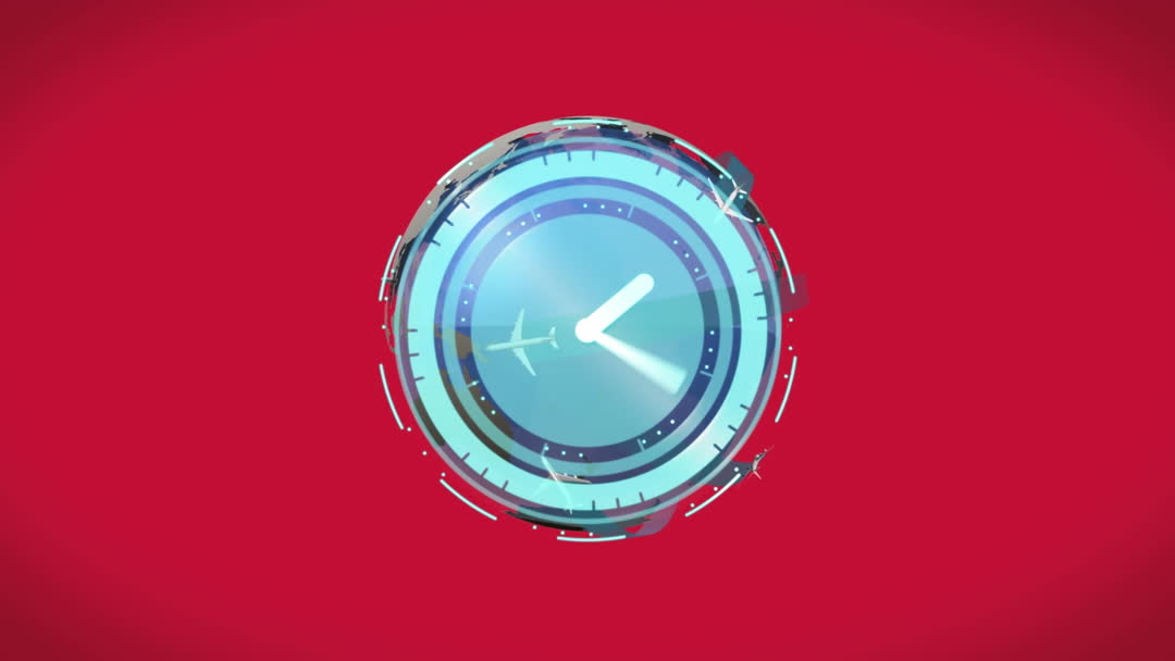 This design features a clock with airplane videory on a vibrant red background and dynamic red points. Represents time travel and aviation concepts. Useful for projects on travel, futuristic themes, and animation storytelling.