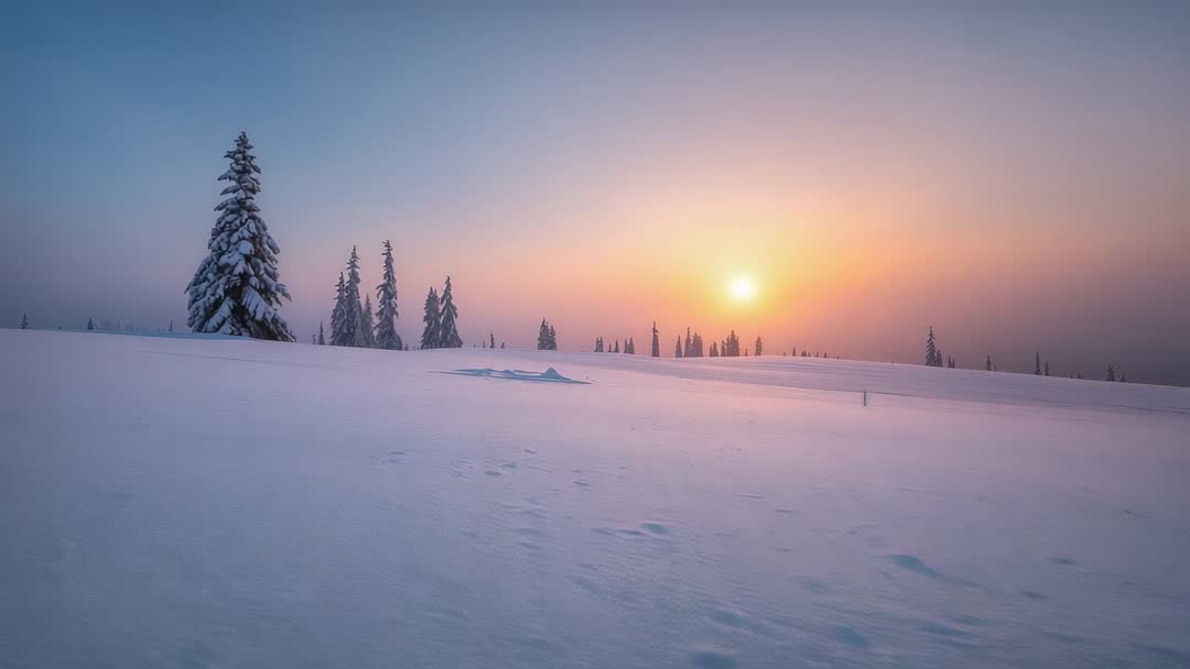AI Generated Video. Video capturing sunrise over vast snow-covered meadow, featuring lone evergreen in near foreground and distant pine silhouettes along horizon. Soft alpenglow bathing snow in pastel pink and blue tones, while low fog adding depth and cinematic mood. Footprints crossing foreground creating subtle leading lines and hint of human presence. Offering serene opening shot for travel and tourism promos, seasonal greeting reels, nature documentaries, wellness and meditation videos, website hero banners, social media backgrounds, and desktop wallpapers. Best used in widescreen 16:9, color grading enhancing warm highlights, and slow-motion or timelapse playback with gentle ambient soundtrack for calming atmosphere.