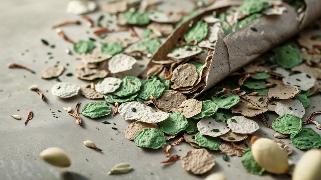 AI Generated Image. Flavored snack crisps spilling from a paper cone provide a dynamic and colorful array on a gray tabletop. The snacks, in various shades of green and beige, offer a contrast against the muted background, enhancing the visual appeal. The rustic and casual approach makes it suitable for use in culinary blogs, food packaging designs, or marketing materials promoting gourmet snacks. Its vibrant nature can be engaging on social media platforms or in publications focusing on modern dining and creative cuisine concepts.