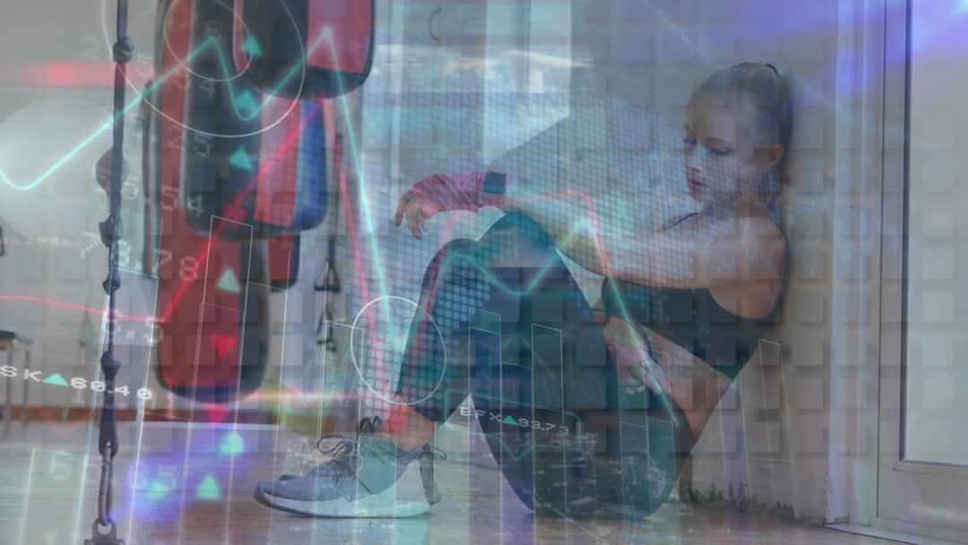 Image illustrates intersection of fitness and technology, showing a boxer resting in gym with overlay of financial graphs and surveillance elements. Suitable for themes on sports-tech integration, modern security solutions in sports environments, and trends in economic impact of fitness technology. Ideal for articles or materials discussing synergy between physical performance and technological advancements.