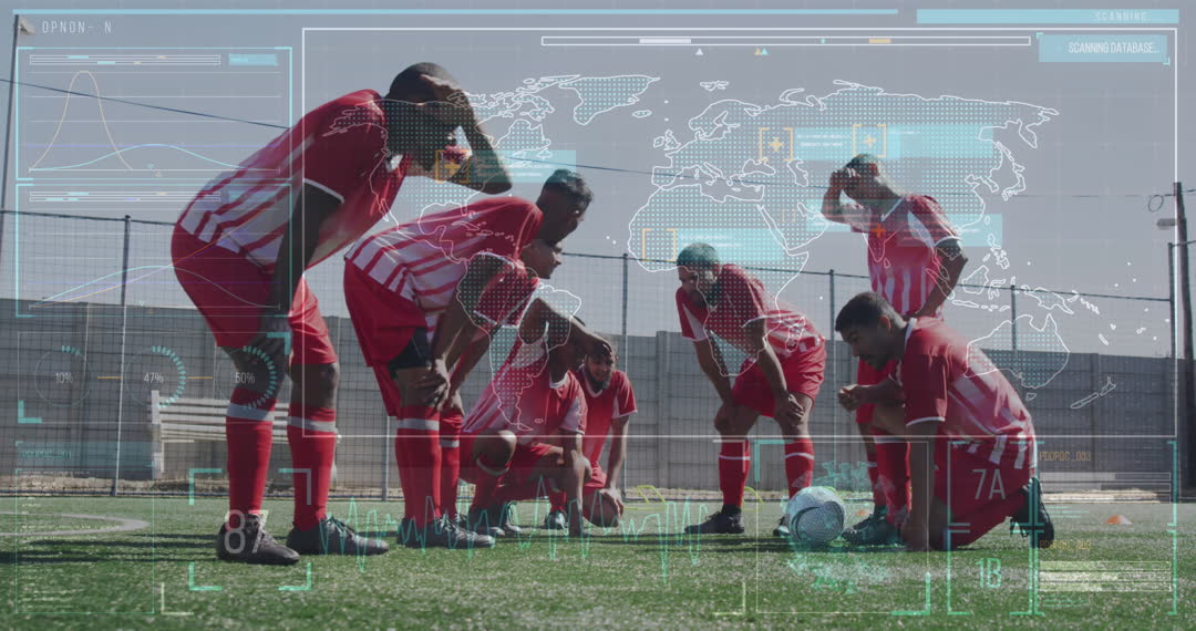 A group of diverse male football players in red and white garments looking exhausted while slumping over on a pitch. Over them is an animated digital interface showing data and a world map. This dynamic scene communicates themes of strategy, performance analysis, and the incorporation of technology in modern sports. Suitable for illustrating competitive sports environments, technological advancement in athletics, or team strategy planning.