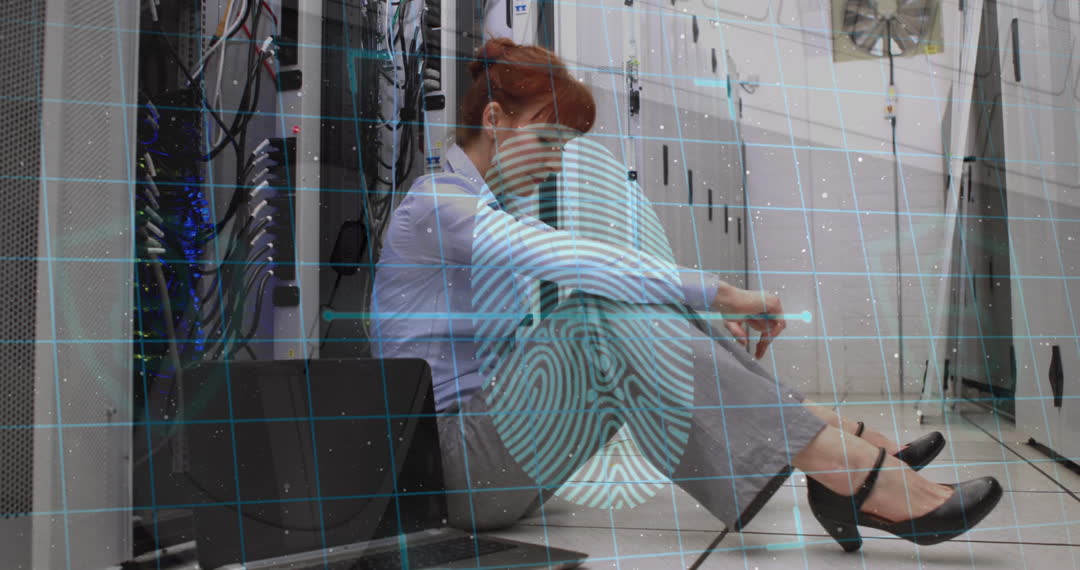 Businesswoman sitting on floor near servers appears stressed as digital fingerprint overlay highlights data vulnerability concerns. Concept includes cybersecurity and global data processing. Ideal for illustrating workplace stress related to IT, cybersecurity challenges, and data protection initiatives.