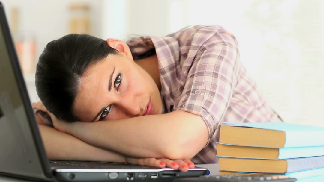 - Tired Student Studying with Books and Laptop Finds Motivation