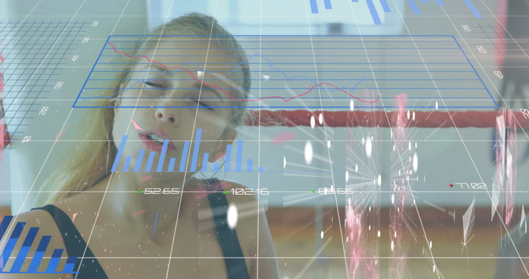 A tired caucasian woman appears overlayed with transparent graphs and chart visuals, symbolizing the intersection of physical and mental exhaustion with financial analysis. Perfect for articles or discussions addressing the stress of balancing physical activities with business and financial responsibilities. Also suitable for concepts related to professional fatigue, business multitasking, or futuristic technology in personal finance tracking.