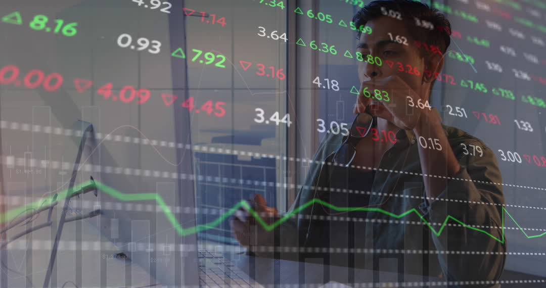 Worker intensely involves studying fluctuating stock market data, reflecting stress and focus common in financial sectors. Red and green numbers contrast background, highlighting analytic environment, useful for illustrating themes like business finance, stock trading analysis, economic fluctuations, and work stress in a bold, visual manner.