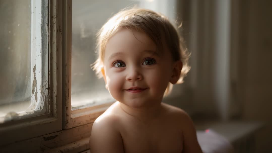 AI Generated Image. Close-up video frame showing shirtless toddler sitting on window seat, smiling and gazing toward camera with soft morning light filtering through worn wooden window frame. Warm backlight and shallow depth of field creating gentle, intimate mood, highlighting expressive eyes and tender smile. Working well for parenting and family lifestyle content, baby product advertising, pediatric and childcare websites, social media reels, blog headers, greeting cards, and ad campaigns focusing on warmth and trust. Editing suggestions: applying warm color grade, adding slow dissolve transitions, pairing with ambient piano music for emotional, calm scenes. Model release recommended when using name or likeness for commercial use.