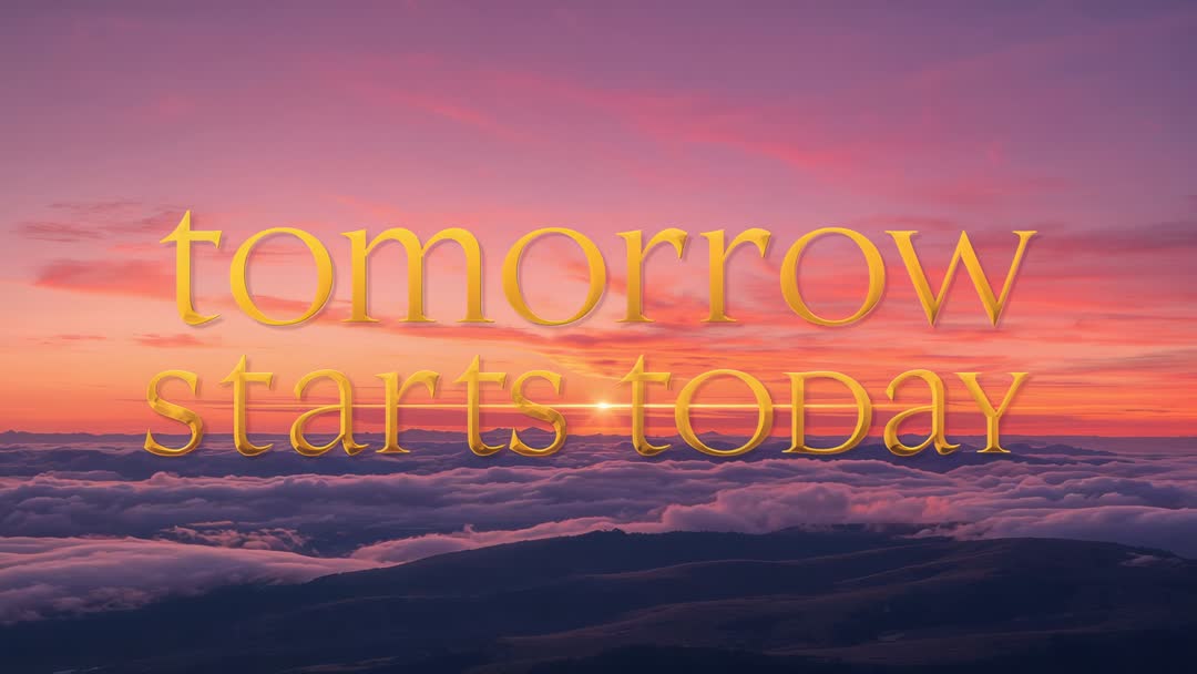 - Tomorrow Starts Today glowing gold 3D text rising over sunrise cloud deck