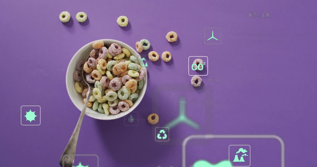 Video showing top-down view of colorful cereal rings in white bowl on purple tabletop, spoon resting inside bowl and scattered rings around. Teal infographic icons floating, popping and moving left, highlighting bowl while displaying eco metrics such as CO2 footprint, recycling badge, water usage, energy symbol and factory emissions. High-contrast purple background creating bold modern look and strong negative space for headline and logo. Use for eco-conscious cereal packaging videos, sustainable breakfast campaigns, social media advertising, product explainer animations, corporate sustainability reports, lifestyle content and brand marketing. Including space for headline, call-to-action and logo placement; supporting voiceover or on-screen stats animation.