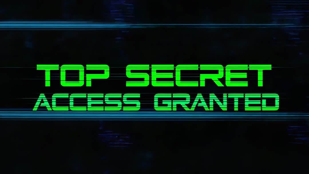 AI Generated Image. Displaying neon green 'TOP SECRET ACCESS GRANTED' text over black background with horizontal cyan scanlines and glitch artifacts, evoking clandestine system access and cyber infiltration. Featuring retro-futuristic terminal typography, flickering scanlines, and sliding data bars for high-tension, high-tech atmosphere. Working well as video intro, title slate, or overlay for hacker montages, cybersecurity awareness clips, tech thriller trailers, and game cutscenes. Suitable for streaming overlays, broadcast bumpers, website hero loops, social media promos, and corporate training modules about security and encryption. Easy to loop and customize; recommend pairing with glitch sound effects, tense synth music, logo overlay, or color grading to match brand palette.