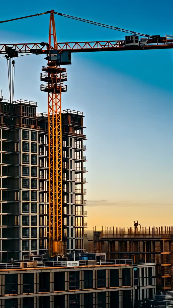 AI Generated Video. Vertical video showing tower crane moving trolley along jib beside high-rise under construction during golden hour. Warm sunset light casting long shadows over scaffolding and concrete floors. Strong vertical composition emphasizing scale and industrial detail. Suiting construction company marketing, real estate development updates, engineering presentations, safety training, urban planning social media, architectural portfolios. Working well as background for title cards, promotional reels, website hero banners, news segments covering development projects. Recommending color grading for cinematic warm tones, adding motion graphics with progress statistics, overlaying logo and contact information. Suggesting cropping for different aspect ratios while keeping crane and building alignment. Including captions about project timeline, contractor name, sustainable materials, or progress milestones. Serving as stock footage for project updates, investor pitches, educational content, editorial coverage of urban growth.