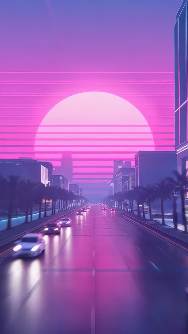 AI Generated Image. Vertical 9:16 video following tracking camera down wet neon boulevard toward oversized magenta sun. Motion blur and car light trails creating dynamic streaks across reflective asphalt. Skyline silhouettes and palm trees framing corridor. Color palette featuring magenta, violet, cyan neon glow with soft gradient sky. Atmosphere moody, retrofuturistic, synthwave. Great for social media vertical ads, music video intros, DJ visuals, app splash screens, fashion lookbooks, cinematic title sequences, background for tech and automotive promos, livestream overlays, club projection mapping. Looping friendly for ambient backgrounds and stage visuals. Add typography overlays, logo reveal, or synth soundtrack for stronger mood. Export as 9:16 vertical clip, optimize at 60fps for smooth tracking and motion blur.
