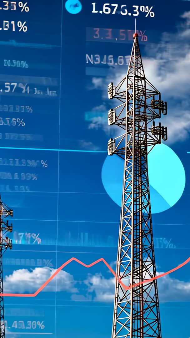 AI Generated Video. Showing tall cell tower in sharp focus against blue sky while overlaying animated trendline, percentage metrics and circular data graphic. Featuring vertical composition and ample copy space for headline, logo or lower-third text. Providing dynamic telecom visual for use in network performance reports, investor presentations, news segments, website hero banners and social media reels. Supporting creative themes around 5G rollout, connectivity analytics, infrastructure investment and IoT deployments, with easy placement for captions, callouts and data labels.