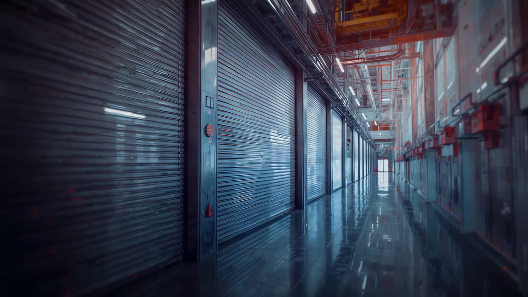 AI Generated Video. Video captures smooth tracking movement inside modern industrial facility corridor. Shiny reflective surfaces of shutter doors provide aesthetics and hints of an automated high-tech environment. LED lights contribute to filming futuristic industrial design embraced by modern technology. Perfect for showcasing advanced manufacturing, innovative design, and future-ready infrastructure in technology illustrations or commercials.