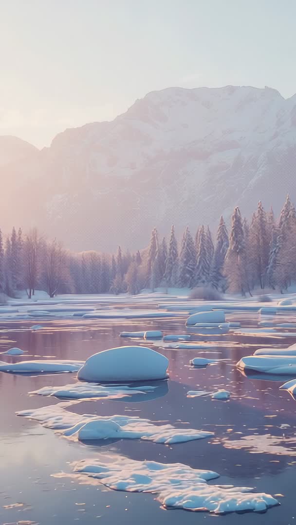 AI Generated Image. Tracking camera moving closer over frozen river while sunrise painting pastel sky and soft light glowing on snow-covered rocks and drifting ice. Mountain ridges and frosted pine trees framing background, water reflecting warm pink and blue tones. Vertical video optimized for mobile (9:16) and ideal for social media reels, stories, phone wallpapers, and vertical ads. Use for travel promos, winter tourism campaigns, wellness and meditation content, seasonal greetings, title sequences, or calming commercial spots. Recommend slow motion playback, gentle color grading to enhance pastel palette, and ambient nature soundtrack to heighten tranquil mood.