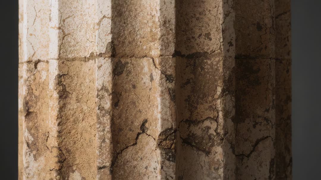 - Tracking shot along weathered fluted stone column revealing cracks, patina and tactile grooves