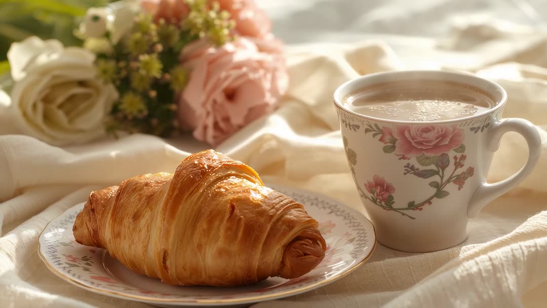 AI Generated Video. Video showing camera panning right and dollies in toward plate with flaky croissant and floral teacup filled with coffee. Soft morning light filtering across linen, rose bouquet softly out of focus in background. Camera movement highlighting layered croissant texture and cup foam, creating intimate, cozy mood. Working well for breakfast blog headers, cafe promotion clips, recipe video intros, lifestyle brand social media reels. Using as B-roll for bakery commercials, morning routine sequences, product hero content for tea and coffee brands. Pairing with light acoustic music, warm color grading, and overlay text for menu or price callouts.