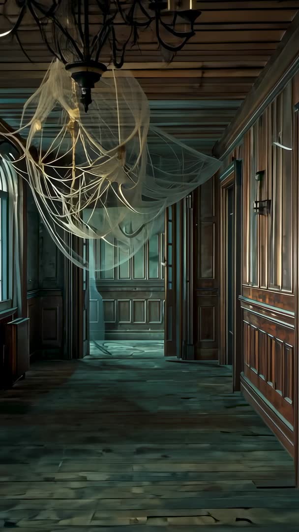 AI Generated Image. Vertical video tracking forward through abandoned mansion wood hall, showing chandelier draped in translucent veil and tangled cobwebs, sliding past ornate wooden paneling and worn floorboards. Lighting casting deep shadows and cool green-blue highlights, creating moody cinematic atmosphere. Suiting horror and thriller openings, haunted house promotions, Halloween campaigns, mystery trailers, film and TV title sequences, and architectural restoration features. Pairing with suspenseful music, slow-fade cuts, or overlay text for dramatic intros. Delivering versatile clip for editors seeking eerie vintage interior visuals for commercial, editorial, or social media content.