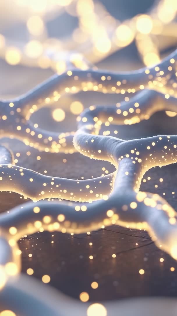 AI Generated Image. Vertical video showing camera shifting focus through glowing particles threaded along organic neural-like network. Camera moving in slow dolly motion while shallow depth of field producing soft bokeh highlights and warm golden light. Composition featuring intertwined tubular strands dotted with floating luminous points, evoking synaptic connections and digital neuron pathways. Atmosphere blending futuristic tech vibes with subtle organic texture, suitable for science and AI themes. Usage ideas: background for tech product launch and AI presentation, opening sequence for science documentary, motion graphics overlay for social media vertical ads, ambient backdrop for meditation app or music video, hero loop for website header or mobile wallpaper. Technical notes: 4K vertical orientation, loop-friendly sections, gentle camera shift, warm gold and cool blue palette, high contrast bokeh, close-up macro feel.