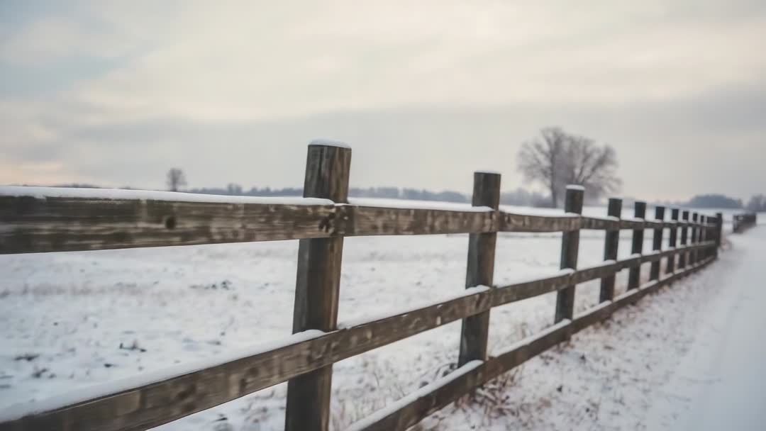 AI Generated Video. Video clip tracking weathered wooden fence receding into snow-covered field, revealing rails topped with thin snow and distant bare trees on horizon. Shot using shallow depth of field and soft overcast light, creating muted palette and strong leading lines for cinematic composition. Useful for winter rural lifestyle, agriculture, land management, seasonal blog, travel, real estate, or editorial projects. Suitable for hero banners, social media headers, background loops, or B-roll in documentaries. Easy to color grade for colder tones or warmer nostalgic looks, and to overlay text or logo in sky area for promotional use.